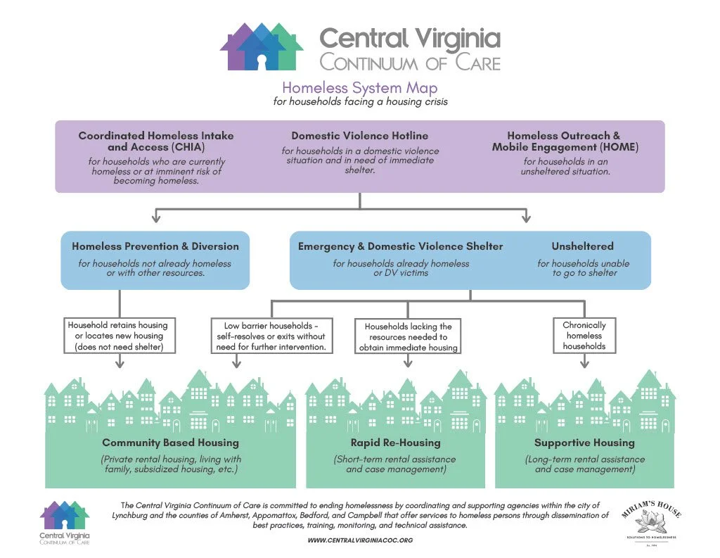 A centralized entry point to the homeless services for households who are homeless or at risk of homelessness in the City of Lynchburg and the surrounding counties of Amherst, Appomattox, Bedford, and Campbell County. If you experiencing homelessness or will lose housing in the next three days, please call 434-427-CHIA.
